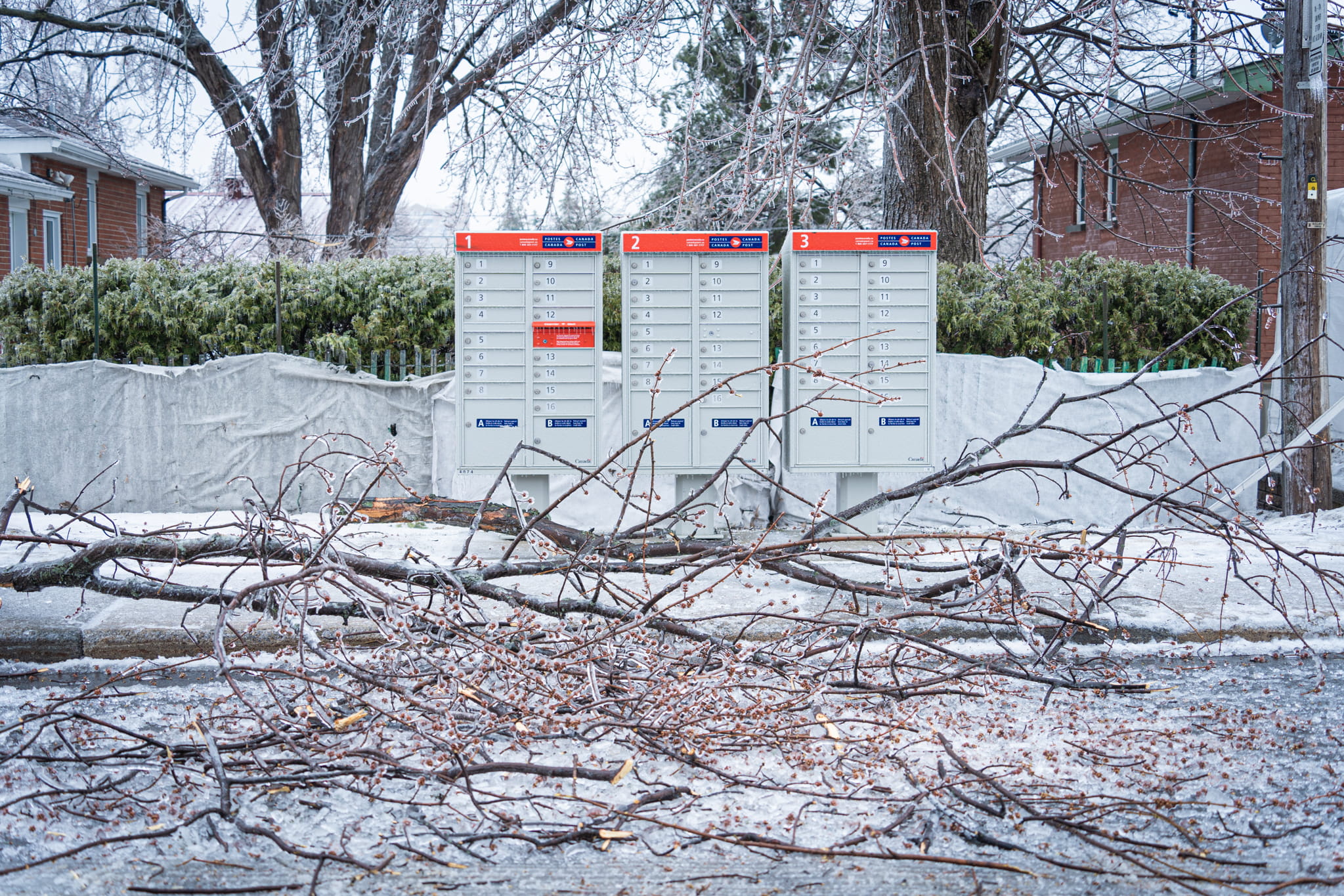 Il n’y a vraisemblablement pas eu de poste cette journée-là. Les services étaient sur pause, tout le monde a été contraint de s’arrêter. Le vif du sujet est là: des arbres sont tombés, de la glace les recouvre et les bourgeons sont emprisonnés. Notre regard est pourtant attiré par le rouge vif des boîtes aux lettres. Non, nous ne pouvons pas simplement aller chercher le courrier cette journée-là. De toute façon, il n’y en nul besoin: les nouvelles du jour nous sont tombées du ciel.