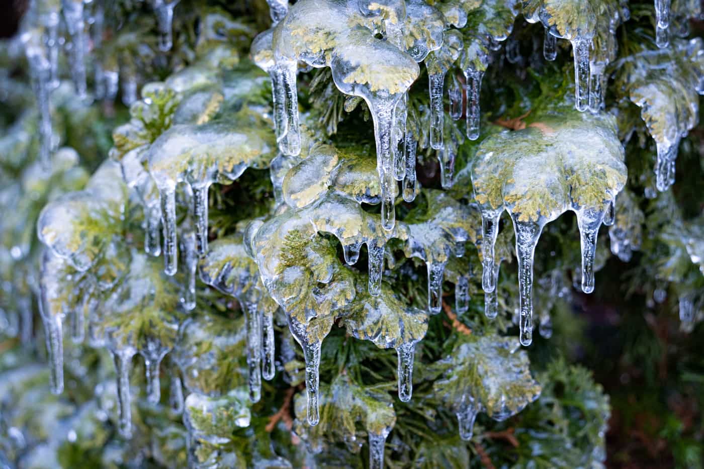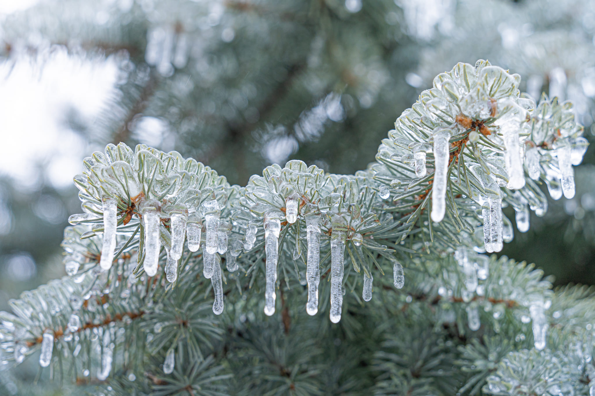 Normalement, on observe les conifères de loin, regardant son imposante stature, son élan naturel vers le ciel. Ici, notre regard est attiré vers le détail. Les aiguilles n’en sont plus vraiment, rassemblées par dizaines dans un glaçon descendant vers le sol. Toute la verticalité de l’arbre perd sa force en étant ramenée vers le bas par le mouvement de l’eau glacée, par cette coulée initiée par la gravité. Les aiguilles semblent douces, à l’opposé de ce qu’elles sont habituellement. On a l’impression de voir la pluie s’abattre en direct sur la nature et la dénaturer, nous faisant plonger dans une douceur et une intimité qui nous surprennent.