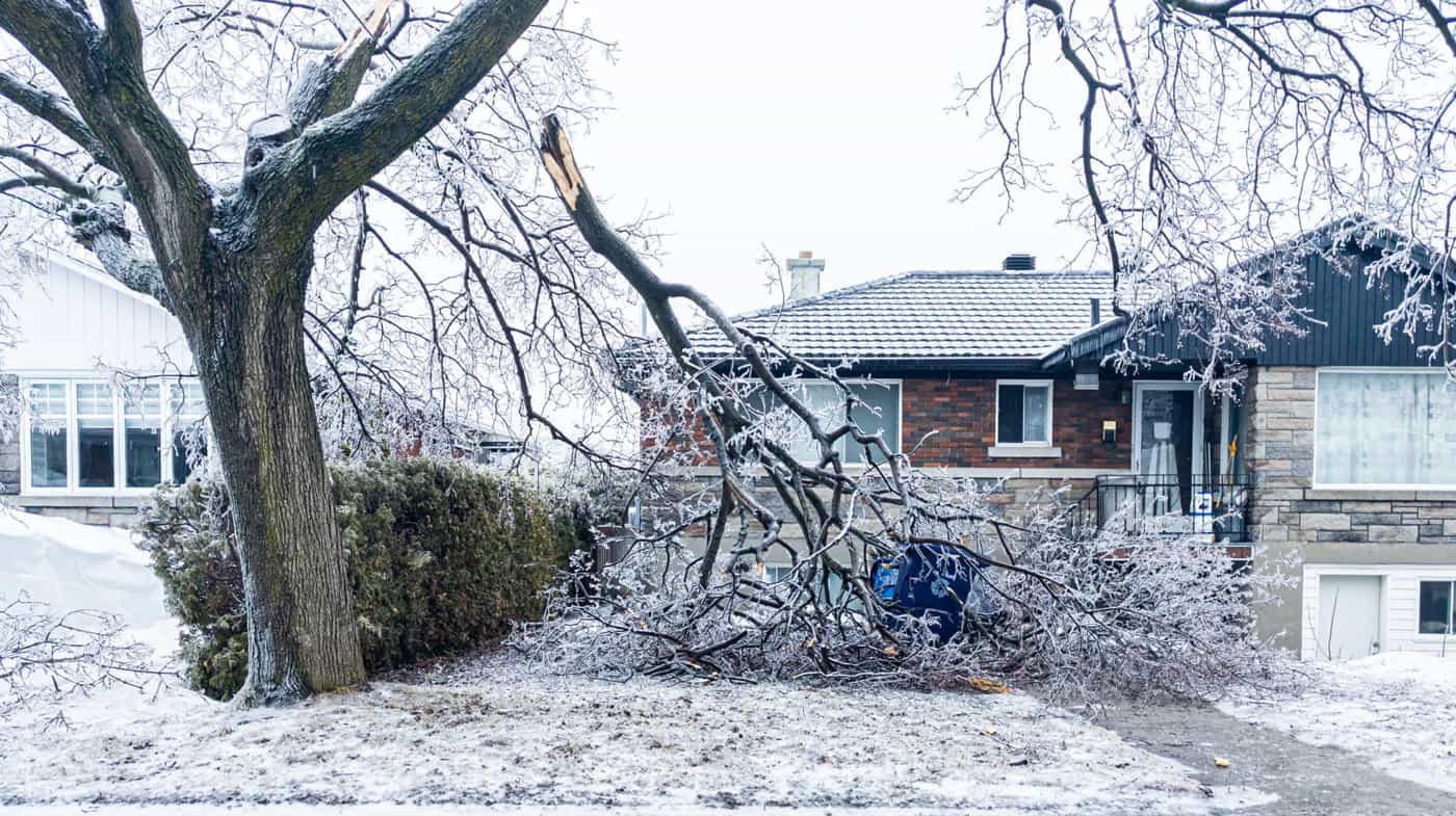 Une branche s’est fracassée sur le terrain. Elle a fait un 90 degrés pour se retrouver là où elle n’aurait pas dû être, dans une direction qui n’était pas la sienne. La branche est venue s’écraser sur le bac de recyclage, ironiquement puisqu’elle va finir aux poubelles. On entrevoit les gros dégâts vécus et le travail qui allait s'ensuivre pour tout réparer.