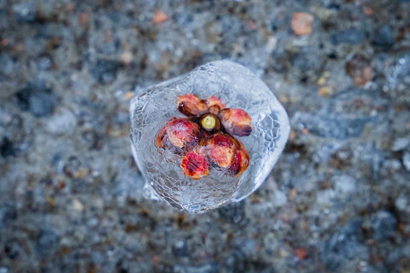 Une fleur de l’année dernière, emprisonnée dans la glace, reflète à la fois la vie et la mort. Cette fleur, ayant représenté la vie dans son entièreté, a laissé place à la mort l’automne dernier. Pourtant, c’est comme si la fleur fanée, qui passait alors inaperçue, redevient impressionnante une fois glacée.